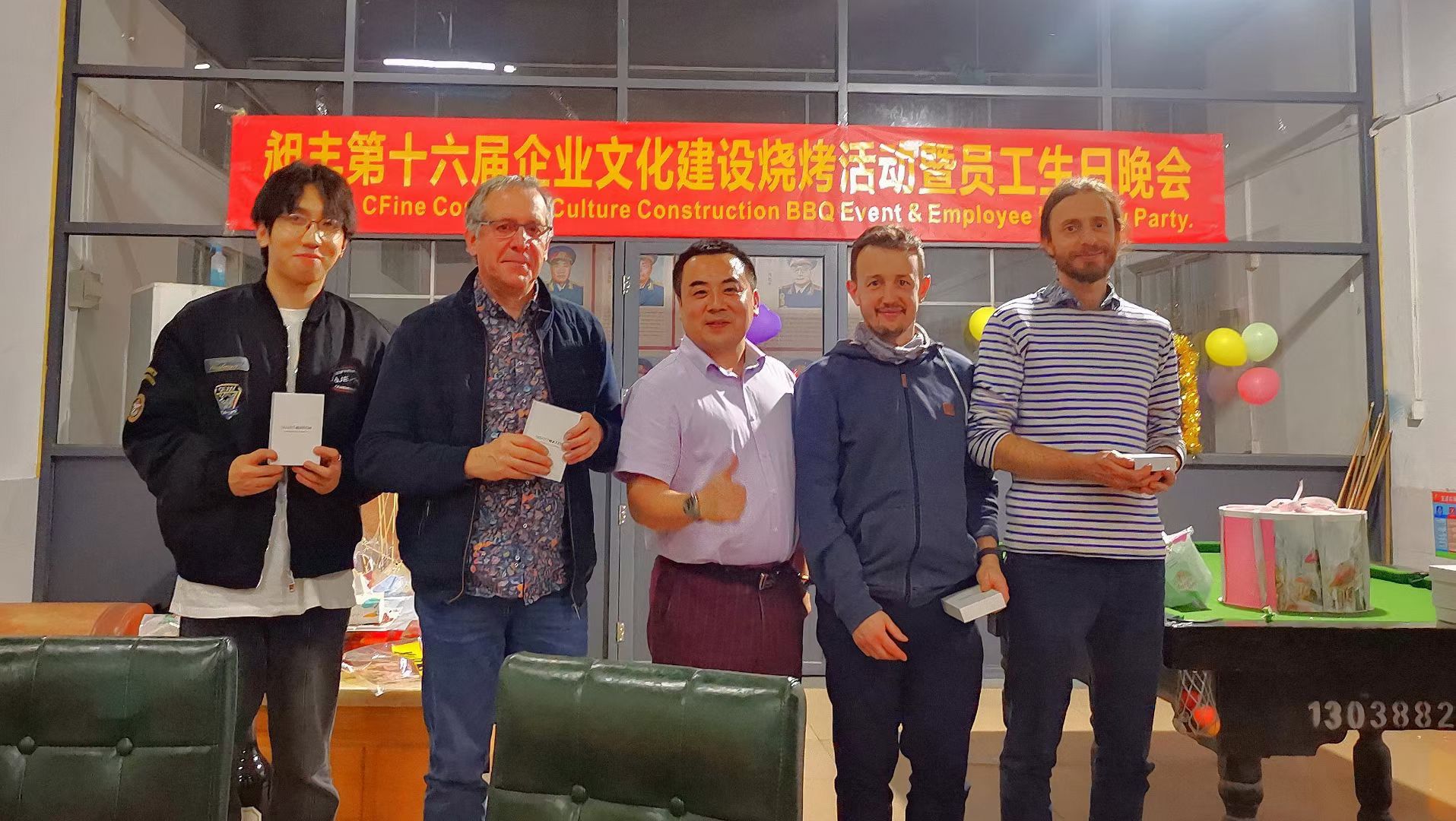 感謝?法國客戶對我們的認可,今天來驗收密煉機,并加入昶豐公司今晚的員工生日會(燒烤活動),對我司企業文化建設表示贊揚!